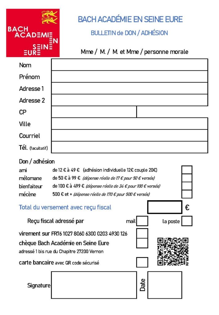 ou par chèque à l’ordre de Bach Académie en Seine Eure