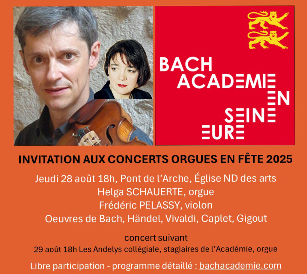 Jeudi 28 août à 18h, église N.-D. des Arts de Pont de l’Arche, concert orgue et violon,